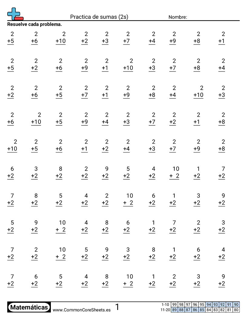 Cada hoja tiene 100 problemas que van desde 2 + 1 hasta 2 + 10.