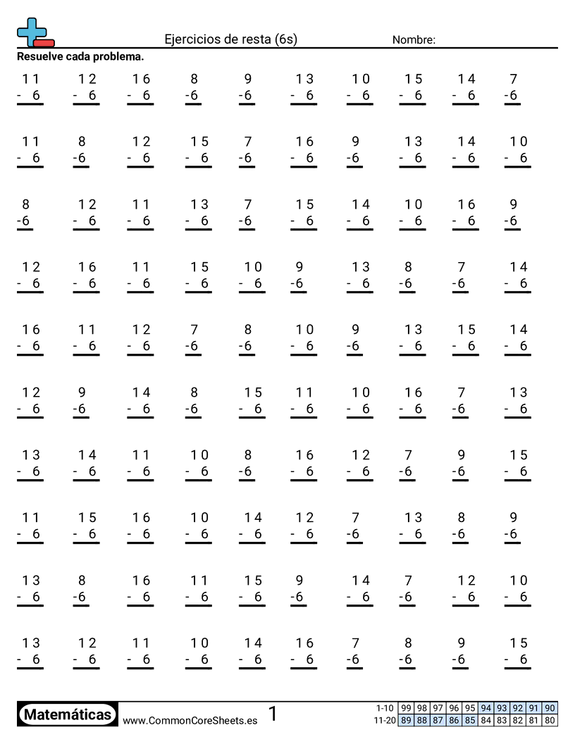 Cada hoja tiene 100 problemas para restar 6 a un número.