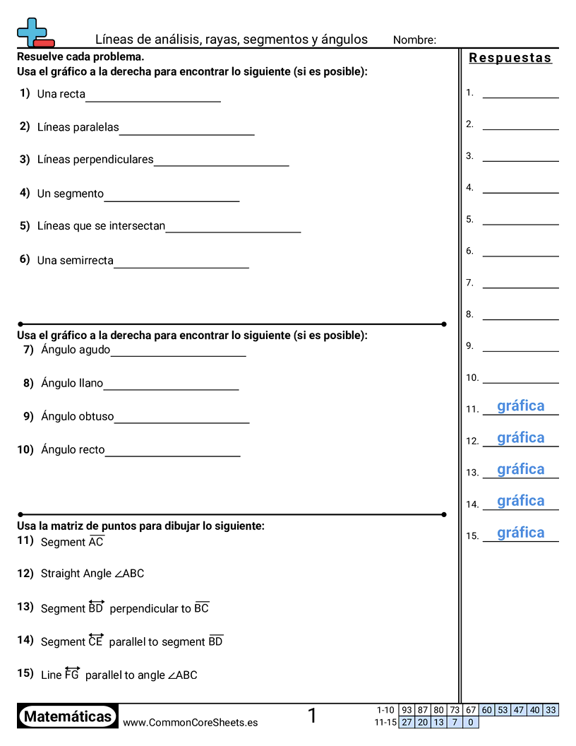 Hojas de trabajo gratis de math sobre Líneas de análisis, rayas, segmentos y ángulos. Cada hoja tiene 15 ejercicios con hoja de respuestas y es ideal para maestros y educación en casa. Puedes descargar el PDF, crear tarjetas de memoria o configurarlo para aprendizaje en línea.