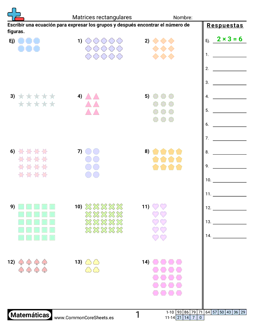 Hojas de trabajo gratis de math para 2do Grado (2oa4) sobre Matrices rectangulares. Cada hoja tiene 14 ejercicios con hoja de respuestas y es ideal para maestros y educación en casa. Puedes descargar el PDF, crear tarjetas de memoria o configurarlo para aprendizaje en línea.