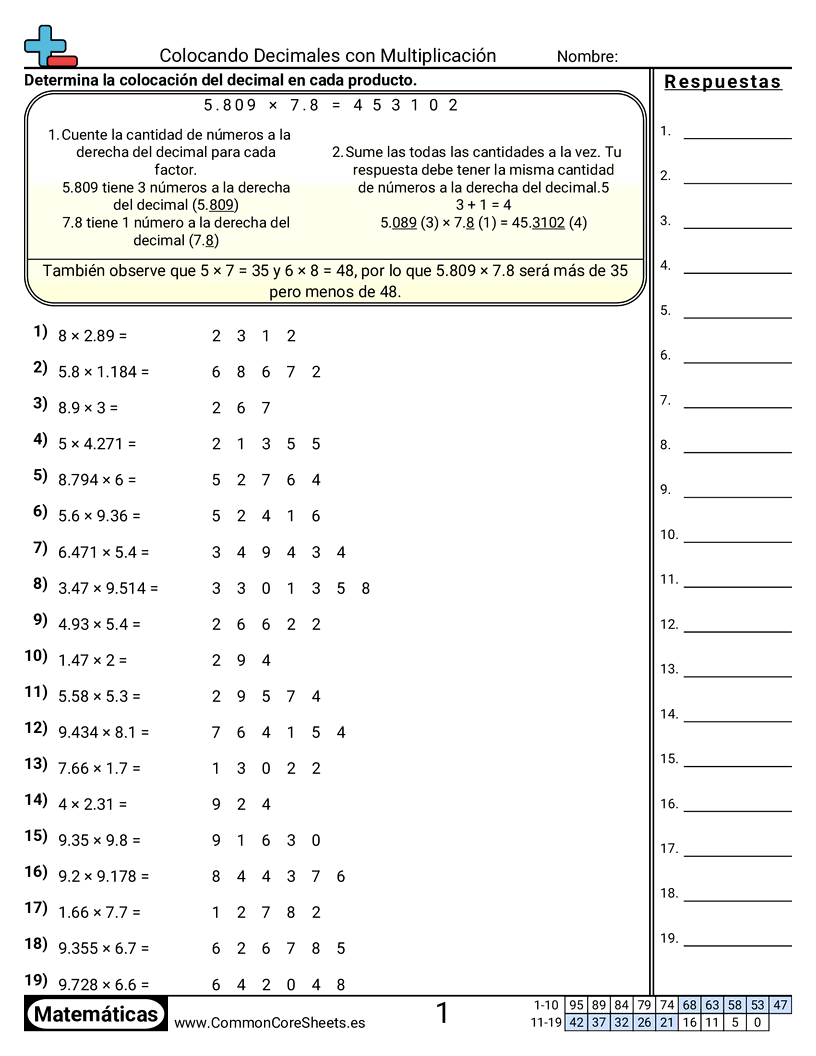 Hojas de trabajo gratis de math para 5to Grado (5nbt7) sobre Colocando Decimales con Multiplicación. Cada hoja tiene 19 ejercicios con hoja de respuestas y es ideal para maestros y educación en casa. Puedes descargar el PDF, crear tarjetas de memoria o configurarlo para aprendizaje en línea.