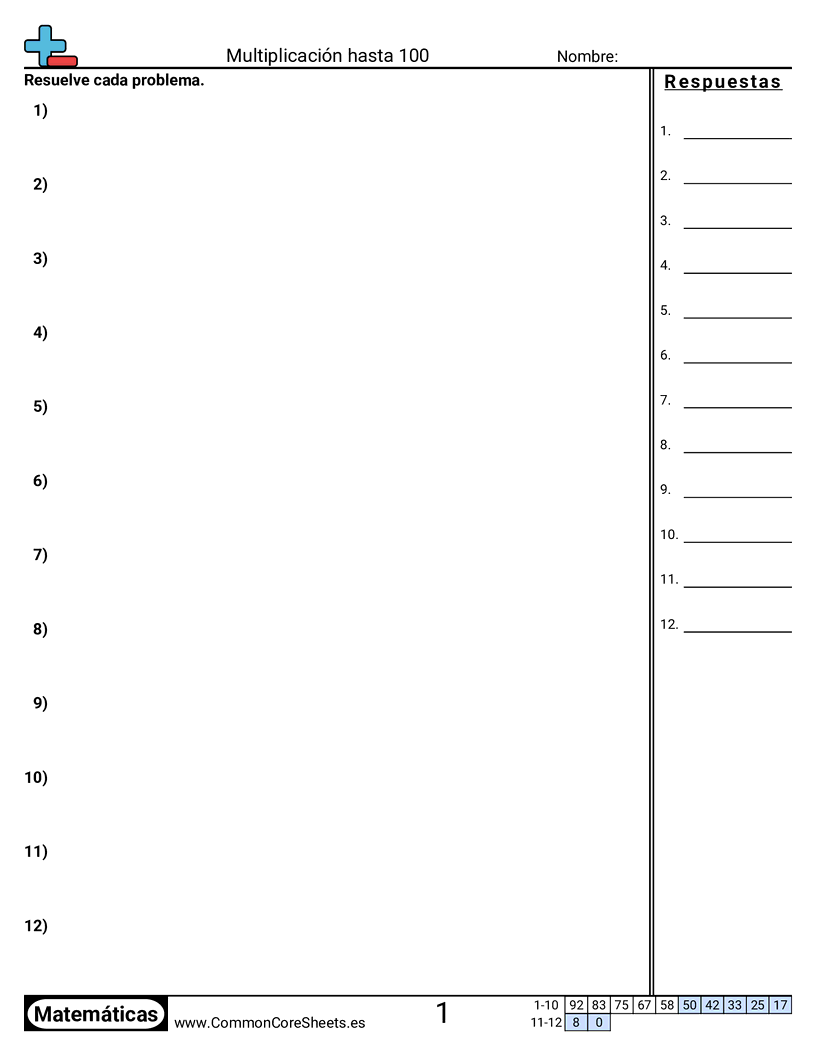 Hojas de trabajo gratis de math para 4to Grado (4oa2) sobre Multiplicación hasta 100. Cada hoja tiene 12 ejercicios con hoja de respuestas y es ideal para maestros y educación en casa. Puedes descargar el PDF, crear tarjetas de memoria o configurarlo para aprendizaje en línea.