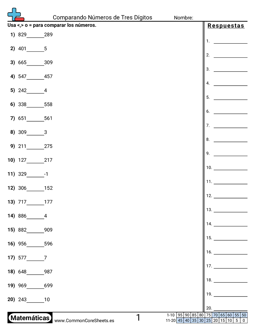 Cada hoja contiene 20 problemas para comparar números de tres dígitos.