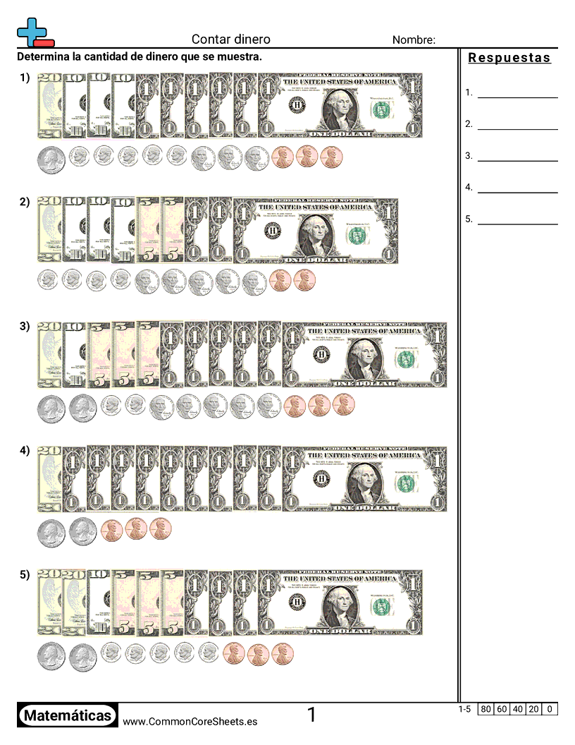 Hojas de trabajo gratis de math sobre Contar dinero. Cada hoja tiene 5 ejercicios con hoja de respuestas y es ideal para maestros y educación en casa. Puedes descargar el PDF, crear tarjetas de memoria o configurarlo para aprendizaje en línea.