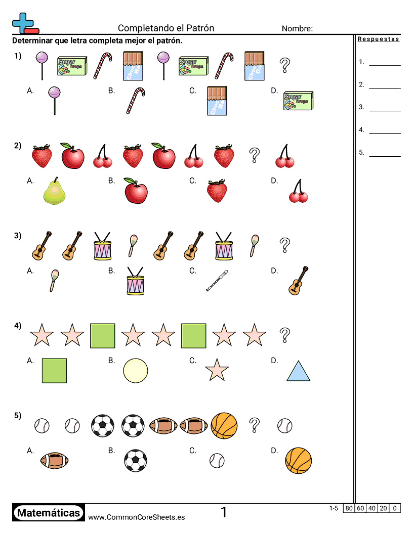 Cada hoja contiene 5 problemas para identificar el elemento que falta en un patrón.