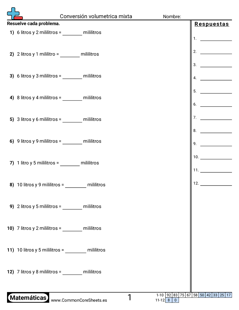 Hojas de trabajo gratis de math sobre Conversión volumetrica mixta. Cada hoja tiene 12 ejercicios con hoja de respuestas y es ideal para maestros y educación en casa. Puedes descargar el PDF, crear tarjetas de memoria o configurarlo para aprendizaje en línea.