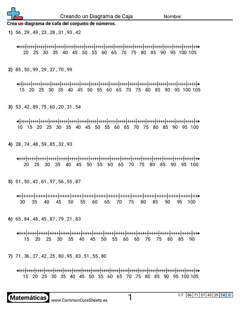 Cada hoja tiene 7 problemas para crear un diagrama de caja a partir de un conjunto de números.