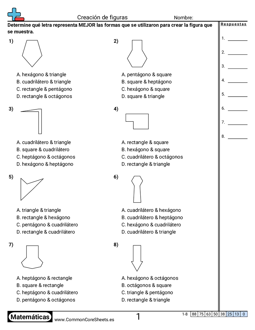Hojas de trabajo gratis de math sobre Creación de figuras. Cada hoja tiene 8 ejercicios con hoja de respuestas y es ideal para maestros y educación en casa. Puedes descargar el PDF, crear tarjetas de memoria o configurarlo para aprendizaje en línea.