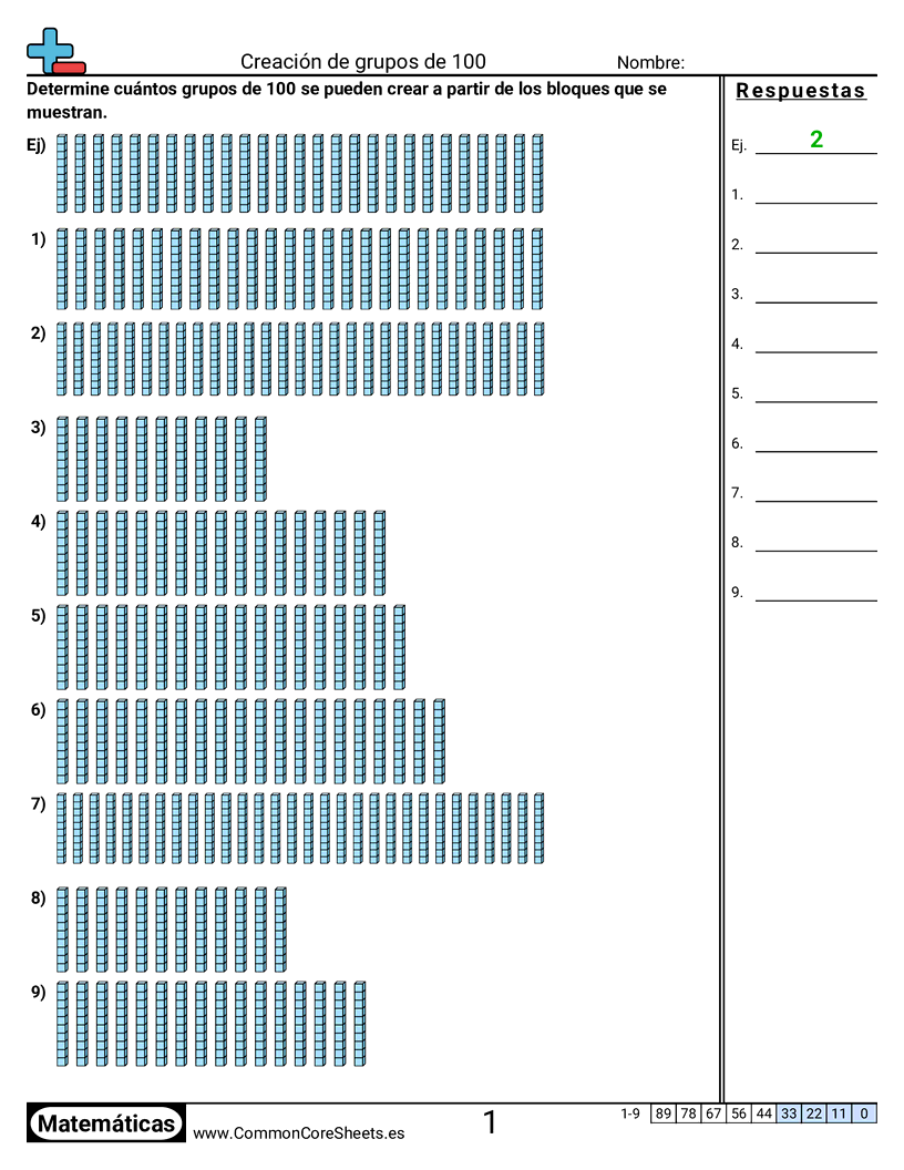 Hojas de trabajo gratis de math para 2do Grado (2nbt1a) sobre Creación de grupos de 100. Cada hoja tiene 9 ejercicios con hoja de respuestas y es ideal para maestros y educación en casa. Puedes descargar el PDF, crear tarjetas de memoria o configurarlo para aprendizaje en línea.