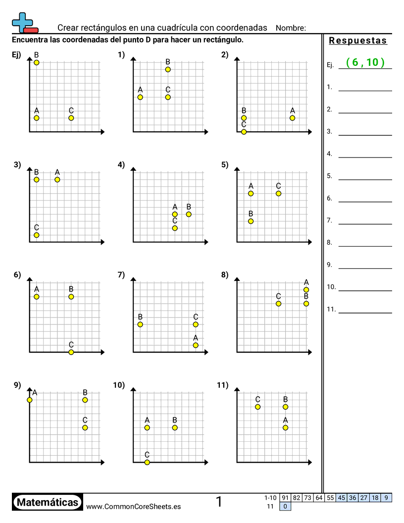 Hojas de trabajo gratis de math para 5to Grado (5g1) sobre Crear rectángulos en una cuadrícula con coordenadas. Cada hoja tiene 11 ejercicios con hoja de respuestas y es ideal para maestros y educación en casa. Puedes descargar el PDF, crear tarjetas de memoria o configurarlo para aprendizaje en línea.