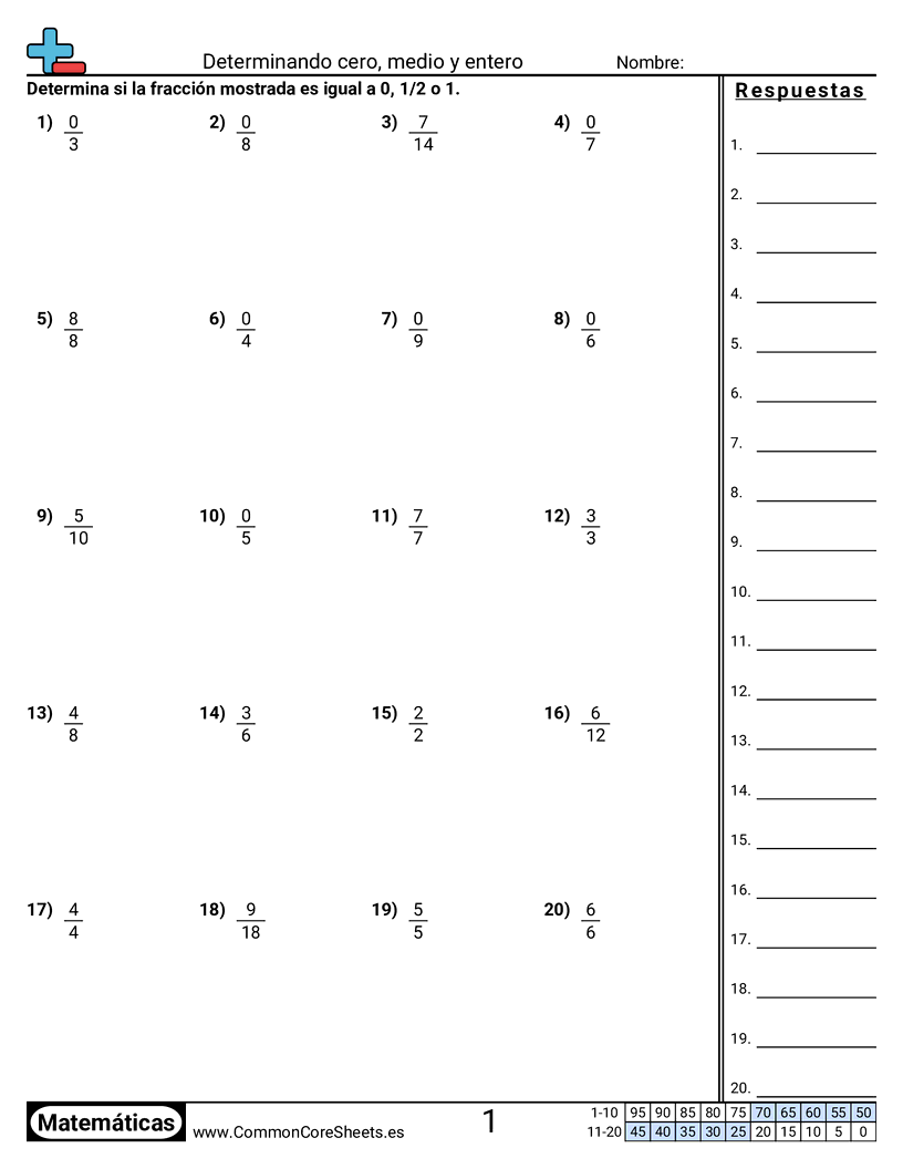 Hojas de trabajo gratis de math para 3er Grado (3nf3d) sobre Determinando cero, medio y entero. Cada hoja tiene 20 ejercicios con hoja de respuestas y es ideal para maestros y educación en casa. Puedes descargar el PDF, crear tarjetas de memoria o configurarlo para aprendizaje en línea.
