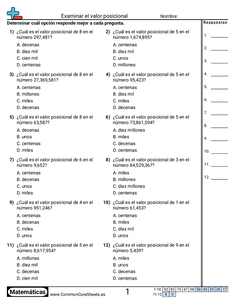 Cada hoja contiene 12 problemas de selección múltiple que determina la posición de valor de un dígito.