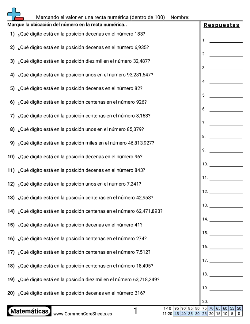 Cada hoja tiene 20 problemas que determinan el valor posicional de un dígito.