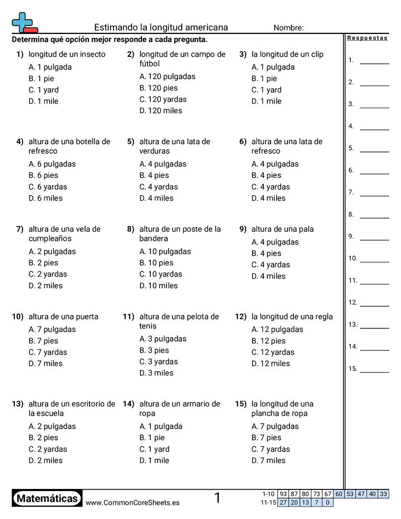 Hojas de trabajo gratis de math para 4to Grado (4md1) sobre Estimando la longitud americana. Cada hoja tiene 15 ejercicios con hoja de respuestas y es ideal para maestros y educación en casa. Puedes descargar el PDF, crear tarjetas de memoria o configurarlo para aprendizaje en línea.