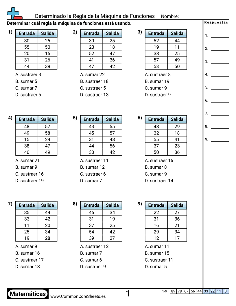 Cada hoja contiene 9 problemas que determinan la regla que una máquina de función está utilizando. Todos los problemas usan reglas de suma o resta de 1 a 50).