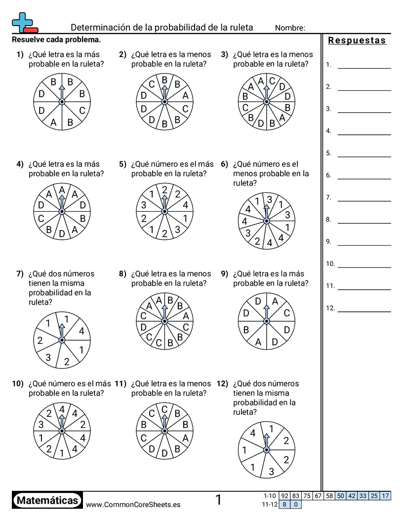 Hojas de trabajo gratis de math sobre Determinación de la probabilidad de la ruleta. Cada hoja tiene 12 ejercicios con hoja de respuestas y es ideal para maestros y educación en casa. Puedes descargar el PDF, crear tarjetas de memoria o configurarlo para aprendizaje en línea.