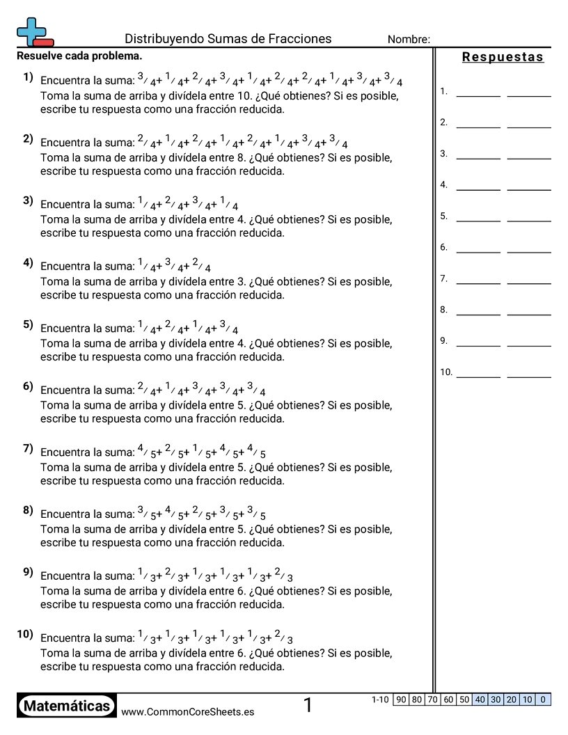 Cada hoja tiene 10 problemas de distribución de las fracciones.