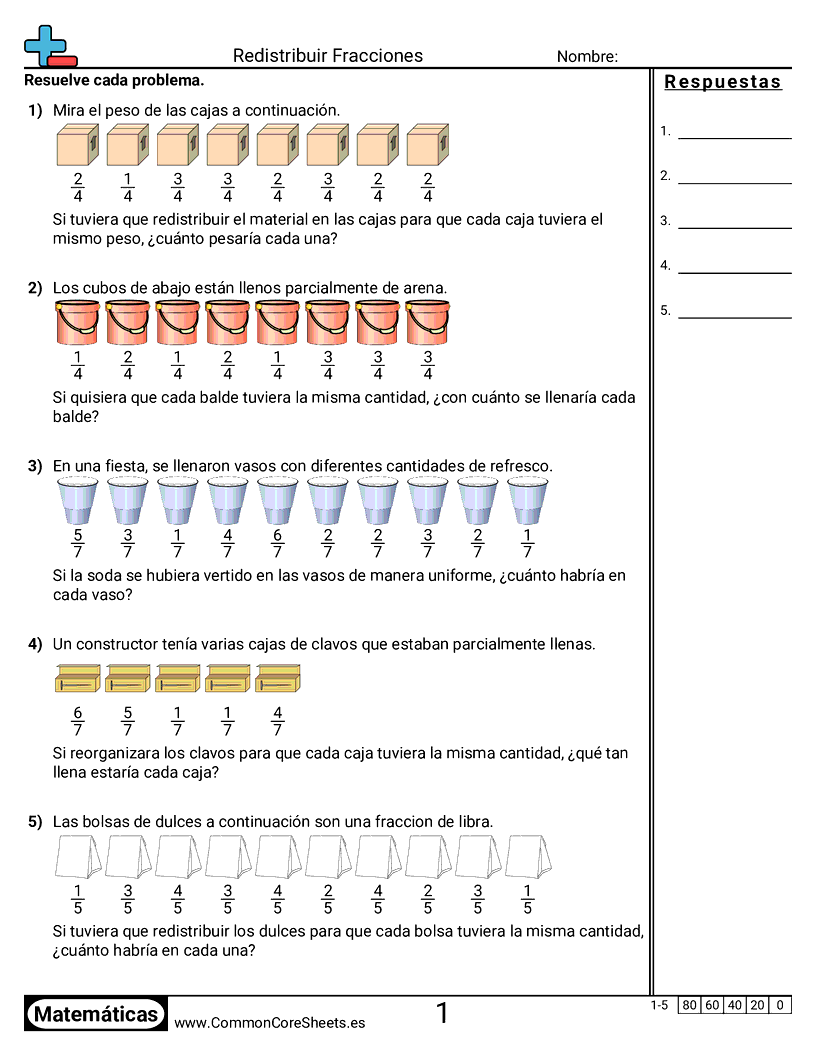 Hojas de trabajo gratis de math para 5to Grado (5md2) sobre Redistribuir Fracciones. Cada hoja tiene 5 ejercicios con hoja de respuestas y es ideal para maestros y educación en casa. Puedes descargar el PDF, crear tarjetas de memoria o configurarlo para aprendizaje en línea.