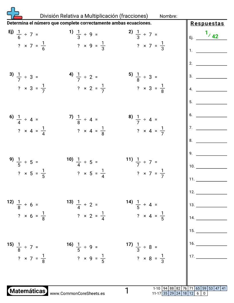 Hojas de trabajo gratis de math para 5to Grado (5nf7a) sobre División Relativa a Multiplicación (fracciones). Cada hoja tiene 17 ejercicios con hoja de respuestas y es ideal para maestros y educación en casa. Puedes descargar el PDF, crear tarjetas de memoria o configurarlo para aprendizaje en línea.