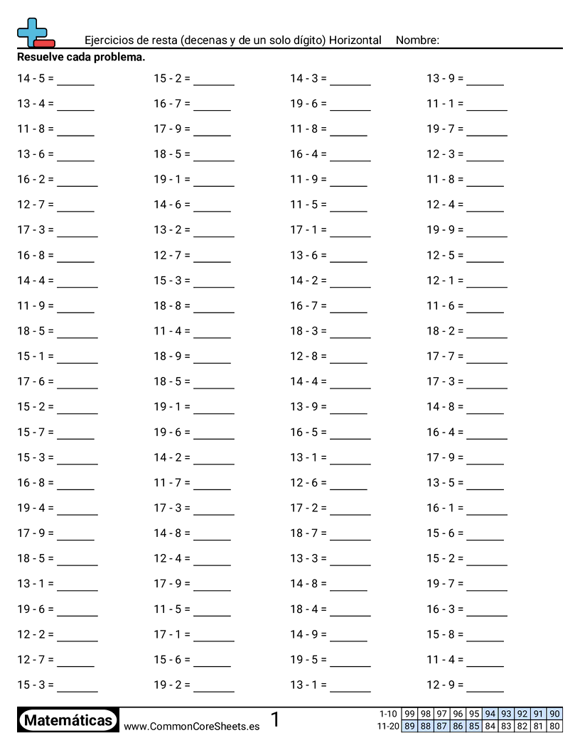Hojas de trabajo gratis de math sobre Ejercicios de resta (decenas y de un solo dígito) Horizontal. Cada hoja tiene 100 ejercicios con hoja de respuestas y es ideal para maestros y educación en casa. Puedes descargar el PDF, crear tarjetas de memoria o configurarlo para aprendizaje en línea.