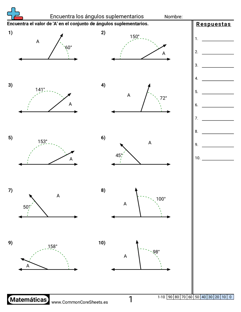 Hojas de trabajo gratis de math para 7mo Grado (7g5) sobre Encuentra los ángulos suplementarios. Cada hoja tiene 10 ejercicios con hoja de respuestas y es ideal para maestros y educación en casa. Puedes descargar el PDF, crear tarjetas de memoria o configurarlo para aprendizaje en línea.