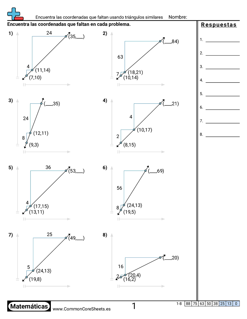 Hojas de trabajo gratis de math para 8vo Grado (8ee6) sobre Encuentra las coordenadas que faltan usando triángulos similares. Cada hoja tiene 8 ejercicios con hoja de respuestas y es ideal para maestros y educación en casa. Puedes descargar el PDF, crear tarjetas de memoria o configurarlo para aprendizaje en línea.