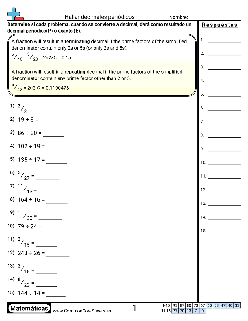 Hojas de trabajo gratis de math para 7mo Grado (7ns2d) sobre Hallar decimales periódicos. Cada hoja tiene 15 ejercicios con hoja de respuestas y es ideal para maestros y educación en casa. Puedes descargar el PDF, crear tarjetas de memoria o configurarlo para aprendizaje en línea.