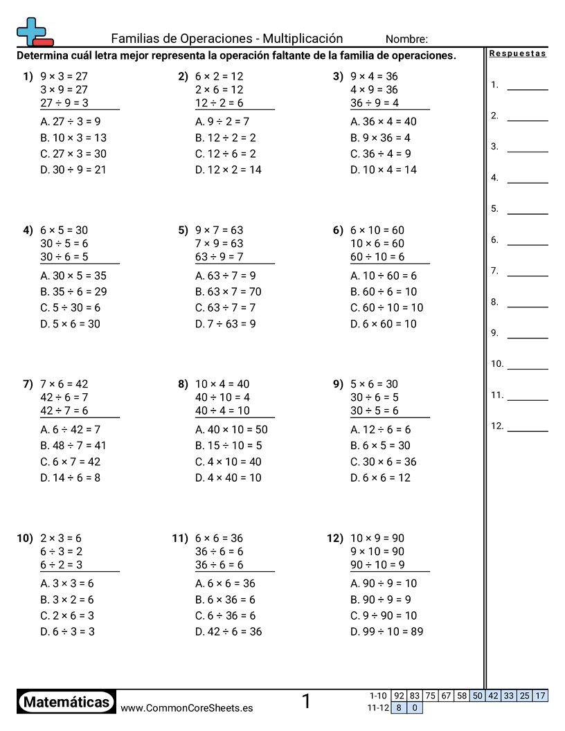 Hojas de trabajo gratis de math para 3er Grado (3oa4) sobre Familias de Operaciones - Multiplicación. Cada hoja tiene 12 ejercicios con hoja de respuestas y es ideal para maestros y educación en casa. Puedes descargar el PDF, crear tarjetas de memoria o configurarlo para aprendizaje en línea.