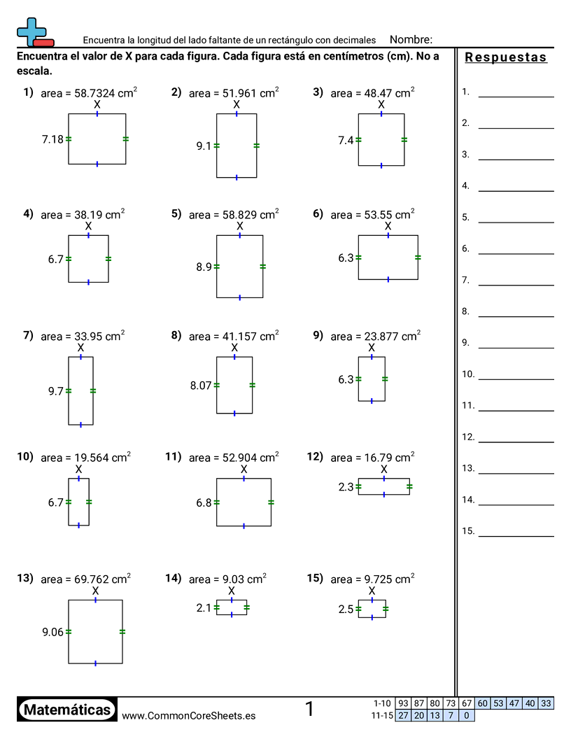 Hojas de trabajo gratis de math sobre Encuentra la longitud del lado faltante de un rectángulo con decimales. Cada hoja tiene 15 ejercicios con hoja de respuestas y es ideal para maestros y educación en casa. Puedes descargar el PDF, crear tarjetas de memoria o configurarlo para aprendizaje en línea.
