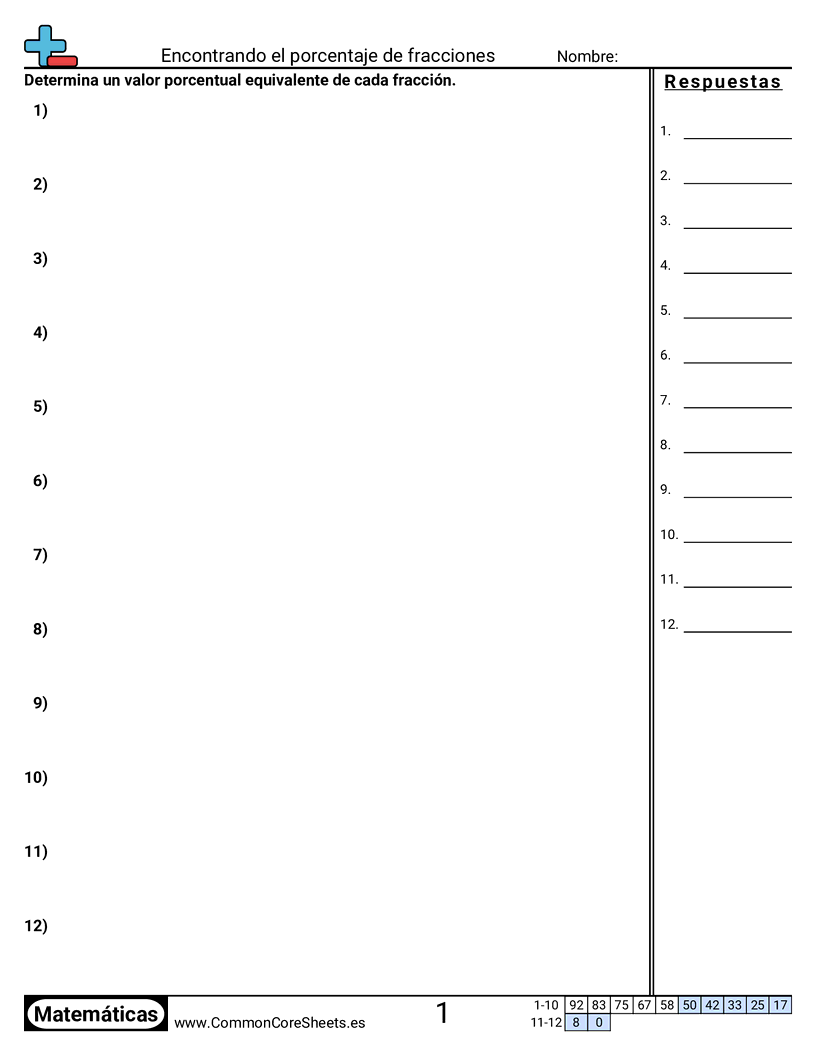 Hojas de trabajo gratis de math sobre Encontrando el porcentaje de fracciones. Cada hoja tiene 12 ejercicios con hoja de respuestas y es ideal para maestros y educación en casa. Puedes descargar el PDF, crear tarjetas de memoria o configurarlo para aprendizaje en línea.
