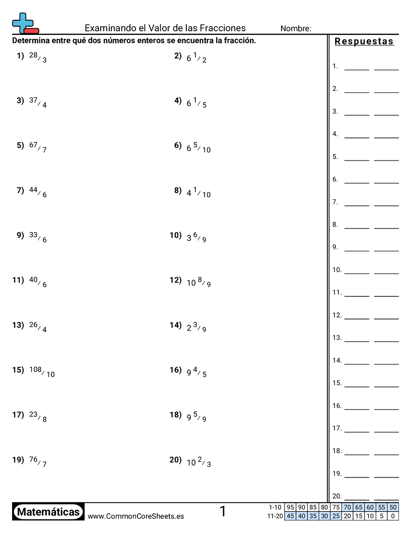 Cada hoja tiene 20 problemas para determinar entre cuales dos números enteros se encuentra una fracción.
