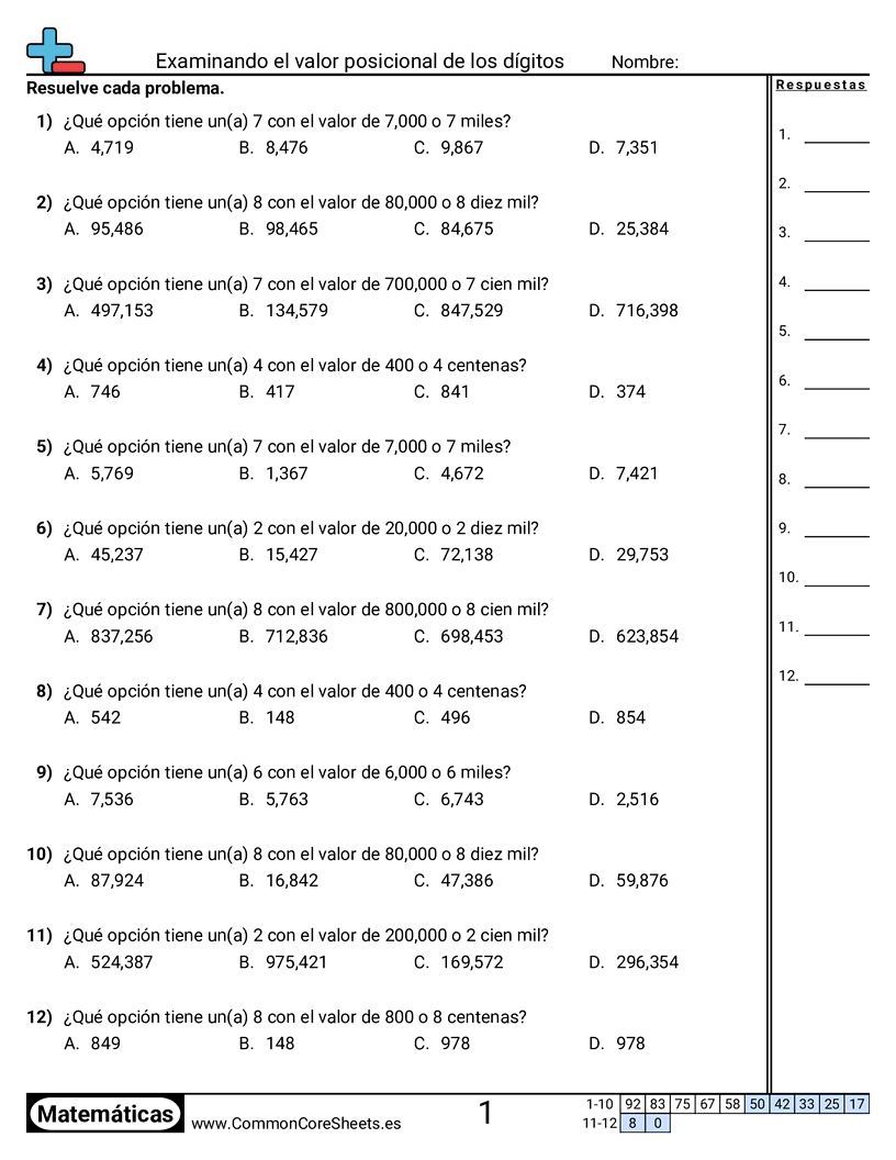 Hojas de trabajo gratis de math sobre Examinando el valor posicional de los dígitos. Cada hoja tiene 12 ejercicios con hoja de respuestas y es ideal para maestros y educación en casa. Puedes descargar el PDF, crear tarjetas de memoria o configurarlo para aprendizaje en línea.