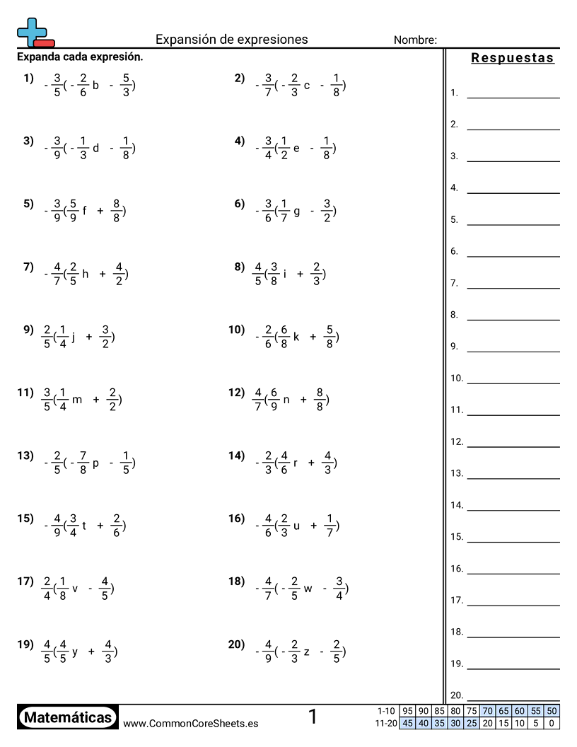 Hojas de trabajo gratis de math para 7mo Grado (7ee1) sobre Expansión de expresiones. Cada hoja tiene 20 ejercicios con hoja de respuestas y es ideal para maestros y educación en casa. Puedes descargar el PDF, crear tarjetas de memoria o configurarlo para aprendizaje en línea.