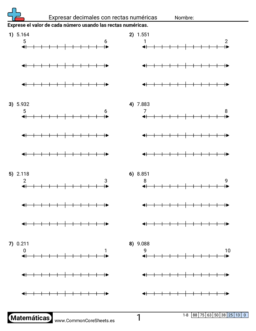Hojas de trabajo gratis de math para 8vo Grado (8ns2) sobre Expresar decimales con rectas numéricas. Cada hoja tiene 8 ejercicios con hoja de respuestas y es ideal para maestros y educación en casa. Puedes descargar el PDF, crear tarjetas de memoria o configurarlo para aprendizaje en línea.