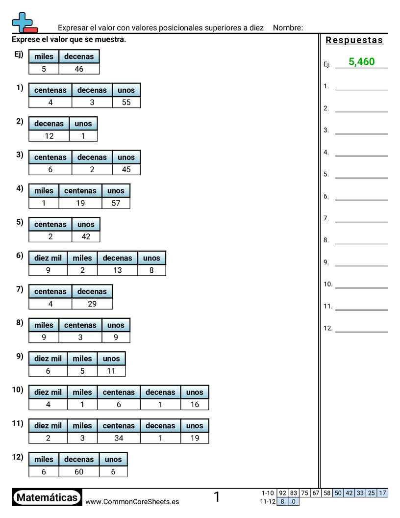 Hojas de trabajo gratis de math para 4to Grado (4nbt1) sobre Expresar el valor con valores posicionales superiores a diez. Cada hoja tiene 12 ejercicios con hoja de respuestas y es ideal para maestros y educación en casa. Puedes descargar el PDF, crear tarjetas de memoria o configurarlo para aprendizaje en línea.