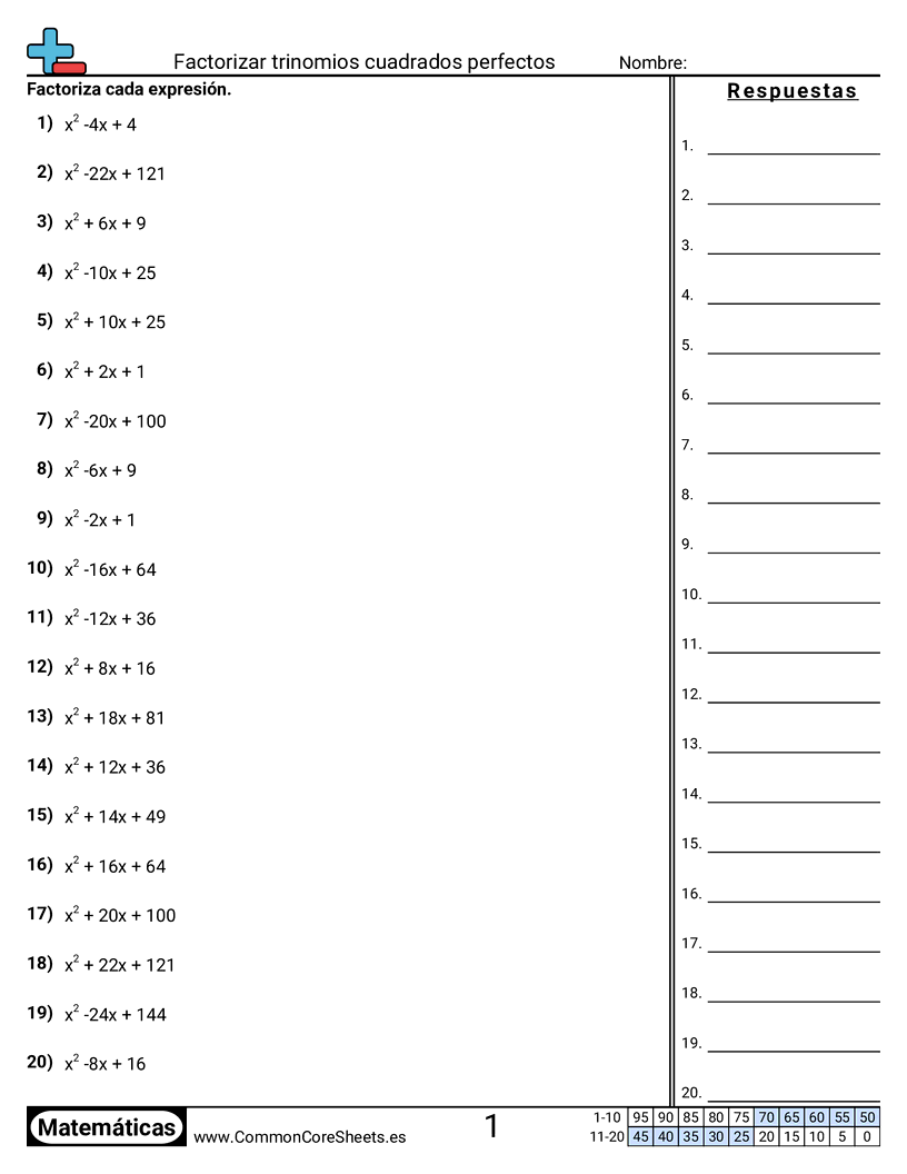 Hojas de trabajo gratis de math sobre Factorizar trinomios cuadrados perfectos. Cada hoja tiene 20 ejercicios con hoja de respuestas y es ideal para maestros y educación en casa. Puedes descargar el PDF, crear tarjetas de memoria o configurarlo para aprendizaje en línea.