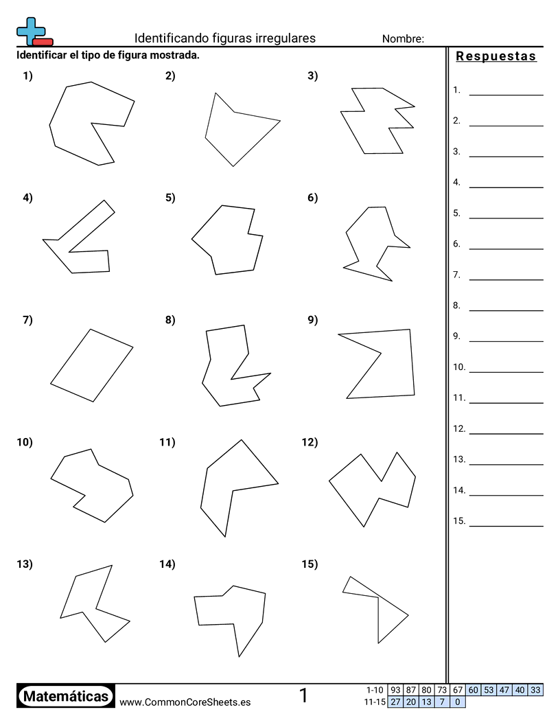 Hojas de trabajo gratis de math para 3er Grado (3g1) sobre Identificando figuras irregulares. Cada hoja tiene 15 ejercicios con hoja de respuestas y es ideal para maestros y educación en casa. Puedes descargar el PDF, crear tarjetas de memoria o configurarlo para aprendizaje en línea.