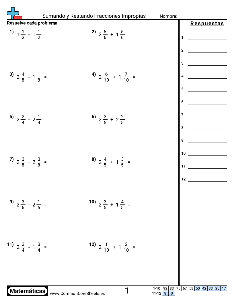 Cada hoja tiene 12 problemas de sumar o restar fracciones impropias con el mismo denominador.