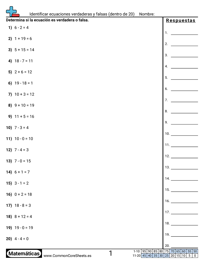 Identificar ecuaciones verdaderas y falsas (dentro de 20)