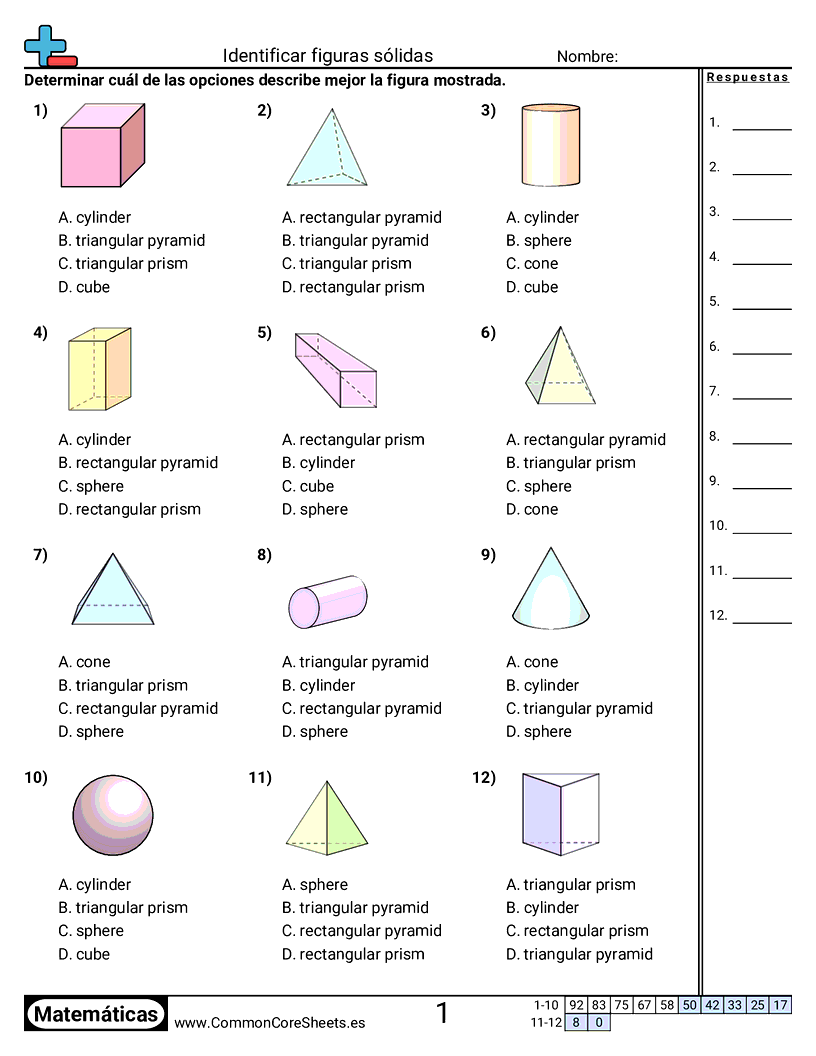 Hojas de trabajo gratis de math sobre Identificar figuras sólidas. Cada hoja tiene 12 ejercicios con hoja de respuestas y es ideal para maestros y educación en casa. Puedes descargar el PDF, crear tarjetas de memoria o configurarlo para aprendizaje en línea.