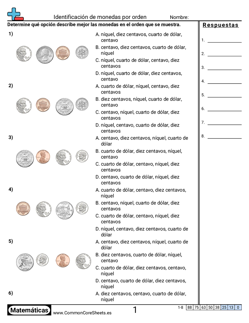 Hojas de trabajo gratis de math sobre Identificación de monedas por orden. Cada hoja tiene 8 ejercicios con hoja de respuestas y es ideal para maestros y educación en casa. Puedes descargar el PDF, crear tarjetas de memoria o configurarlo para aprendizaje en línea.