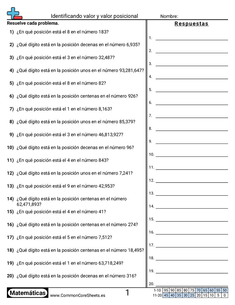 Hojas de trabajo gratis de math sobre Identificando valor y valor posicional. Cada hoja tiene 20 ejercicios con hoja de respuestas y es ideal para maestros y educación en casa. Puedes descargar el PDF, crear tarjetas de memoria o configurarlo para aprendizaje en línea.