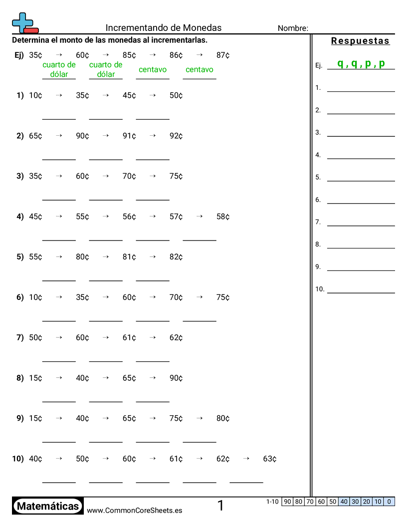 Hojas de trabajo gratis de math sobre Incrementando de Monedas. Cada hoja tiene 10 ejercicios con hoja de respuestas y es ideal para maestros y educación en casa. Puedes descargar el PDF, crear tarjetas de memoria o configurarlo para aprendizaje en línea.