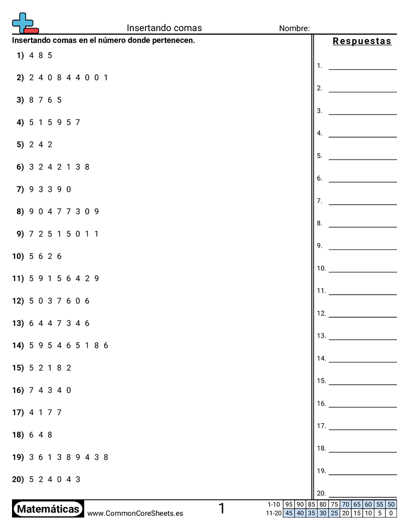 Hojas de trabajo gratis de math sobre Insertando comas. Cada hoja tiene 20 ejercicios con hoja de respuestas y es ideal para maestros y educación en casa. Puedes descargar el PDF, crear tarjetas de memoria o configurarlo para aprendizaje en línea.