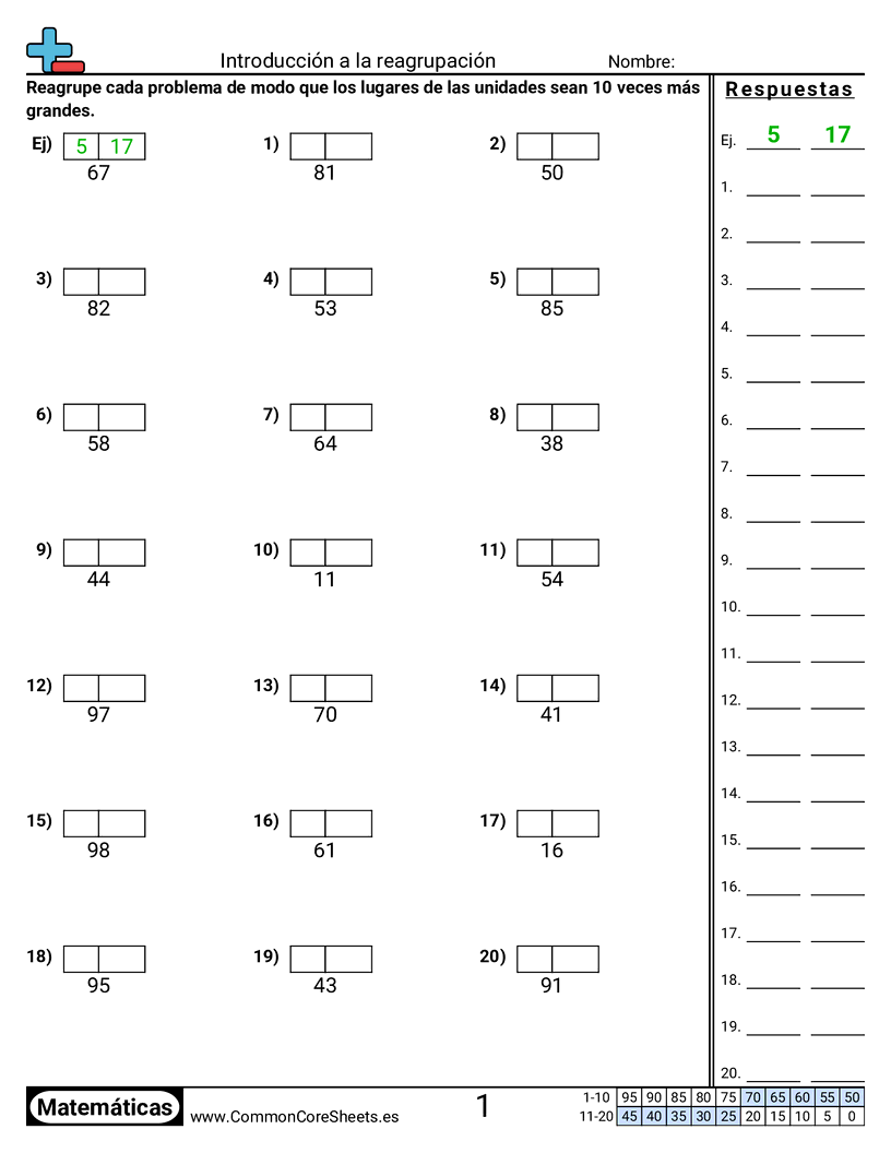 Hojas de trabajo gratis de math sobre Introducción a la reagrupación. Cada hoja tiene 20 ejercicios con hoja de respuestas y es ideal para maestros y educación en casa. Puedes descargar el PDF, crear tarjetas de memoria o configurarlo para aprendizaje en línea.