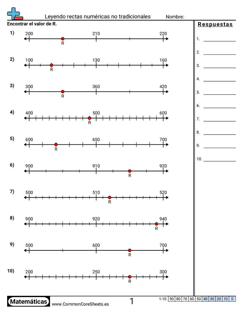 Cada hoja tiene 10 rectas numéricas con numeración no tradicional.