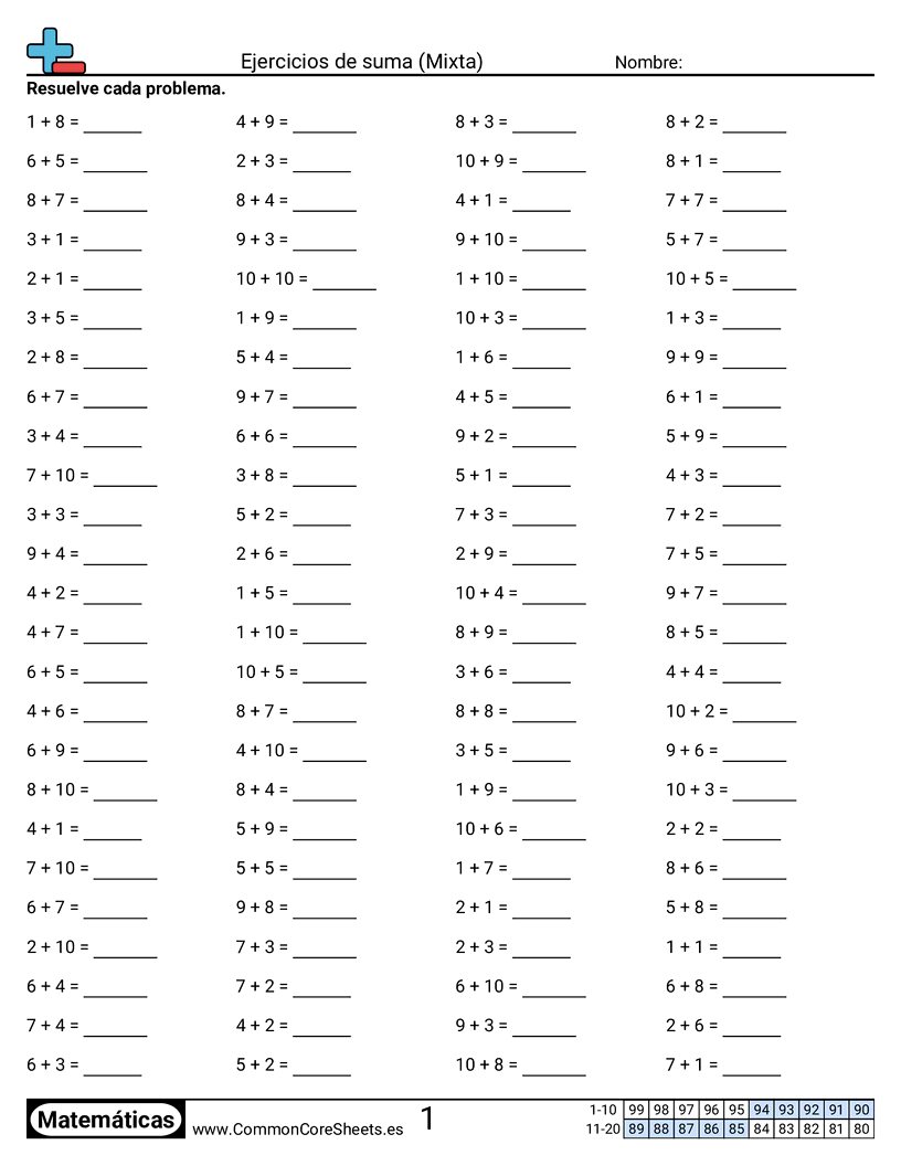 Hojas de trabajo gratis de math sobre Ejercicios de suma (Mixta) . Cada hoja tiene 100 ejercicios con hoja de respuestas y es ideal para maestros y educación en casa. Puedes descargar el PDF, crear tarjetas de memoria o configurarlo para aprendizaje en línea.
