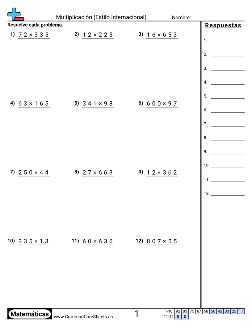 Hojas de trabajo gratis de math sobre Multiplicación (Estilo Internacional). Cada hoja tiene 12 ejercicios con hoja de respuestas y es ideal para maestros y educación en casa. Puedes descargar el PDF, crear tarjetas de memoria o configurarlo para aprendizaje en línea.