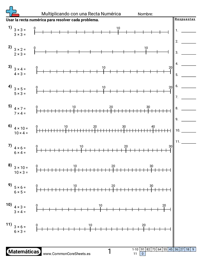 Hojas de trabajo gratis de math para 3er Grado (3oa1) sobre Multiplicando con una Recta Numérica. Cada hoja tiene 11 ejercicios con hoja de respuestas y es ideal para maestros y educación en casa. Puedes descargar el PDF, crear tarjetas de memoria o configurarlo para aprendizaje en línea.