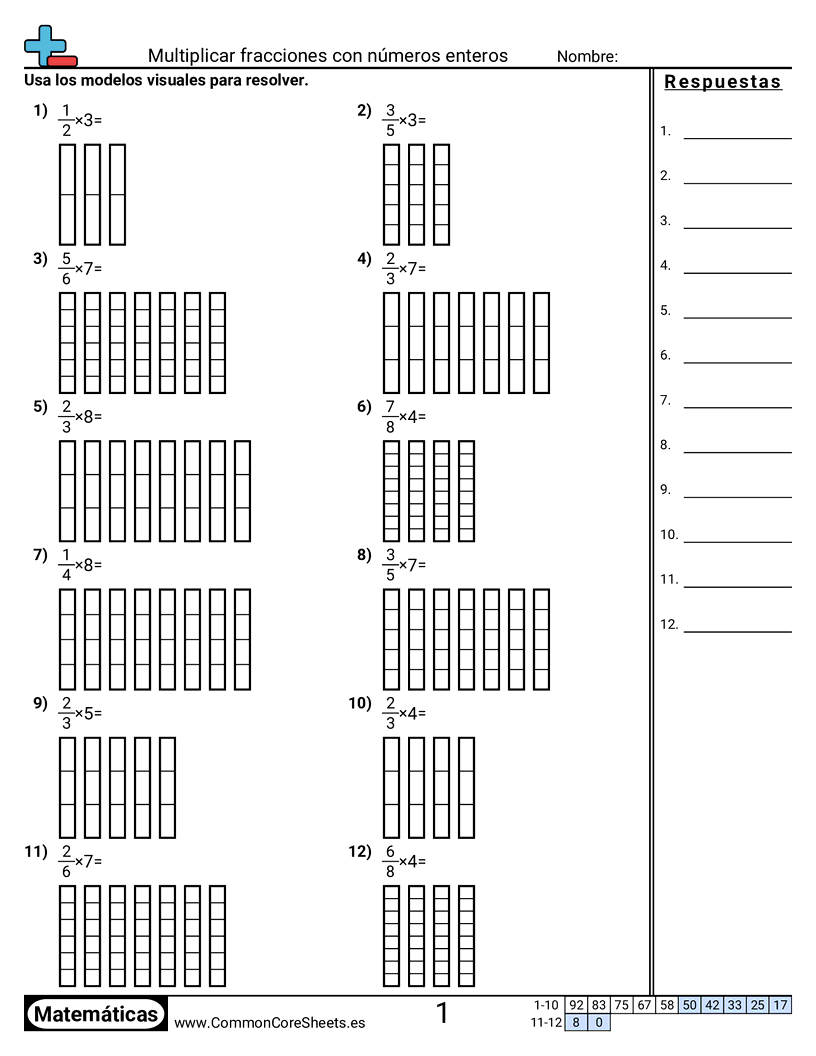 Hojas de trabajo gratis de math para 4to Grado (4nf4b) sobre Multiplicar fracciones con números enteros. Cada hoja tiene 12 ejercicios con hoja de respuestas y es ideal para maestros y educación en casa. Puedes descargar el PDF, crear tarjetas de memoria o configurarlo para aprendizaje en línea.